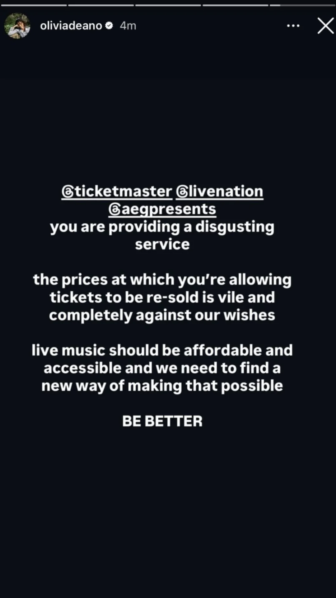 Dean took action swiftly and decisively, posting on Instagram and directly naming Ticketmaster, Live Nation, and AEG for enabling these inflated resale prices. She called their service “disgusting” and “completely against our wishes,” pushing for live music to remain accessible. Her intervention forced Ticketmaster to cap reselling at face value, posting on X “We support artists' ability to set the terms of how their tickets are sold and resold. We're capping resale prices for Olivia Dean's tour on our site at face value and hope other resale sites will follow.” on the same platform they responded to one of the fans saying that the price was ‘a typo’.