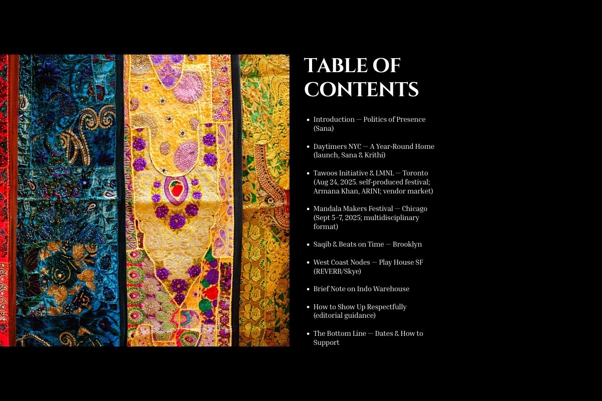Chicago’s Mandala Makers Festival expands the map. Just like Tawoos initiative, Mandala Makers is also turning 7 years old this year. the three‑day, multidisciplinary platform runs September 5–7, 2025 at the Athenaeum Center for Thought and Culture (Lakeview). The weekend mixes classical and contemporary dance, folk traditions, Bollywood showcases, live music, and a club night with a healthy portion of free, public programming alongside ticketed events.