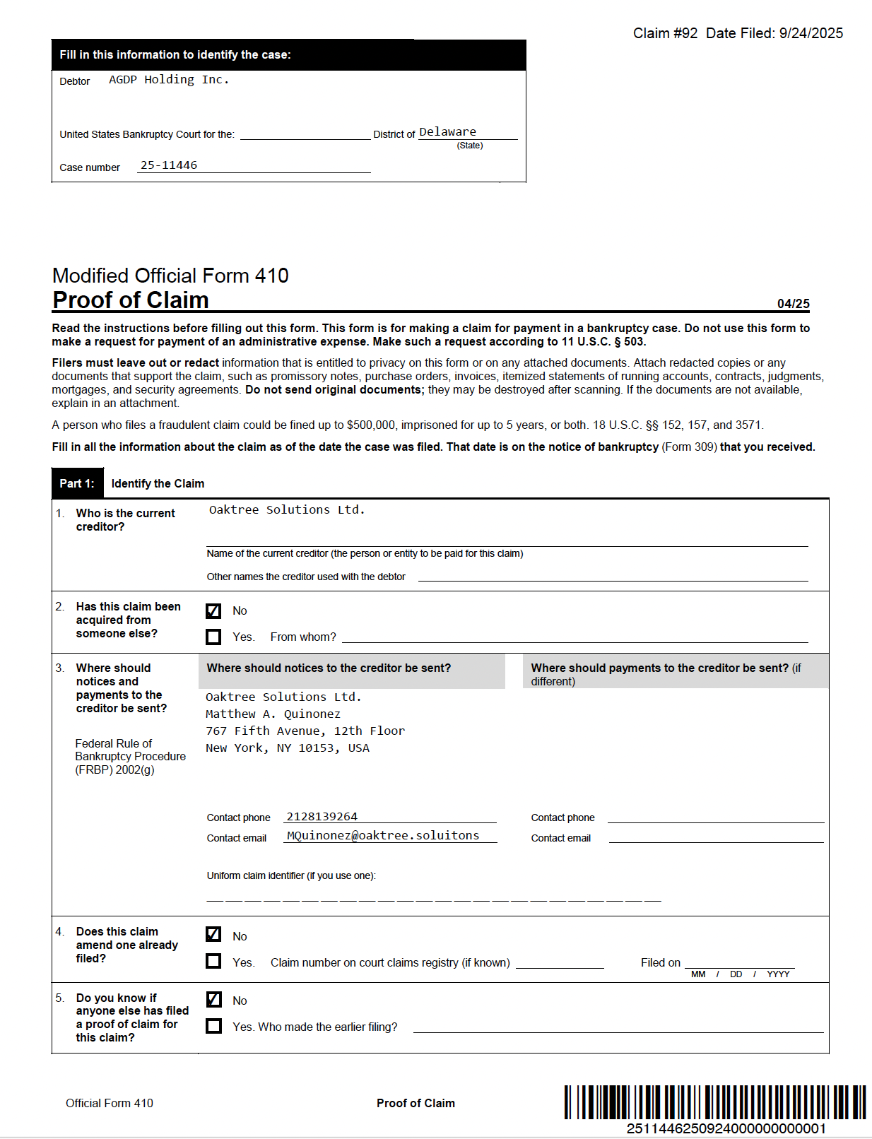Oaktree Solutions Ltd., tied to ex-Adams chief of staff, filed claim in AGDP Holding Chapter 11 case